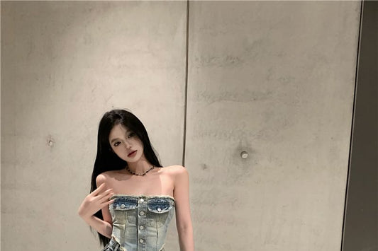 Washed Frayed Button-Up Denim Crop Tube Top / High Rise Ripped Loose Fit Jeans
