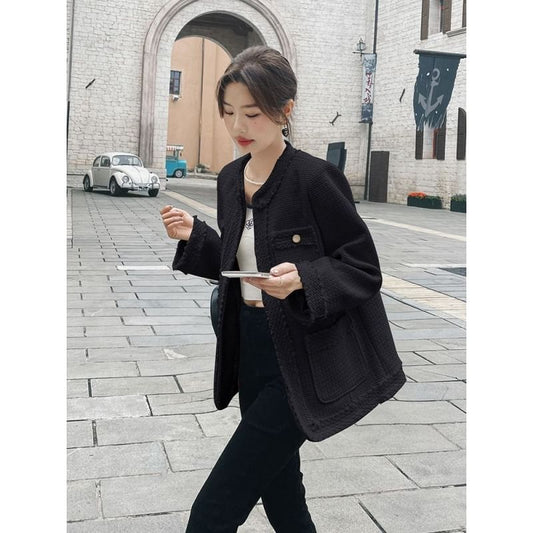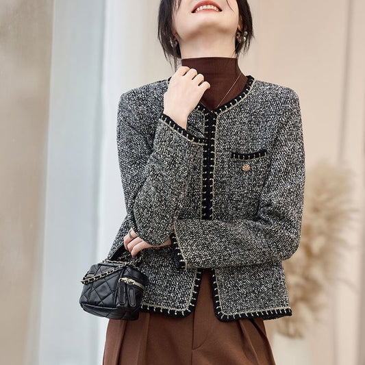 Crew Neck Contrast Trim Open Front Tweed Crop Jacket