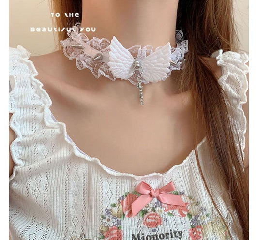 Cross Rhinestone Wing Pendant Studded Lace Choker