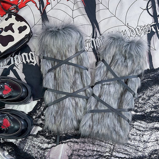 Grey Self-tie Strap Shaggy Plush Leg Warmers