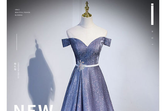 Off-Shoulder Plain Glitter Tie Waist A-Line Ball Gown
