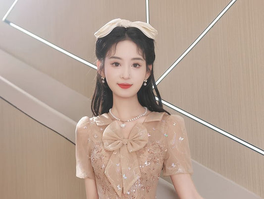Short-Sleeve Collared Sequin Bow Ruffle Mesh A-Line Evening Gown