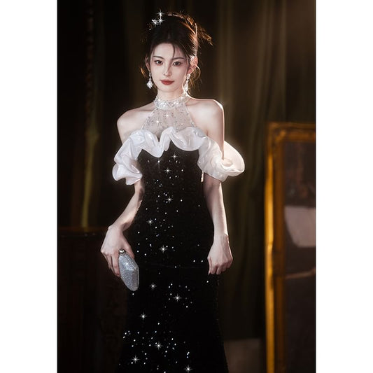 Short-Sleeve Cold Shoulder Sequin Mermaid Evening Gown