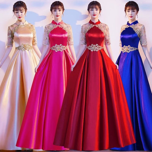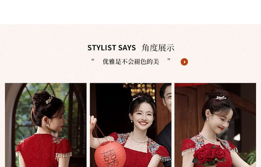 Short-Sleeve Slit Sequin Midi Chinese Wedding Qipao Dress