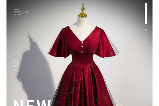 Short-Sleeve V-Neck Mesh A-Line Evening Ball Gown