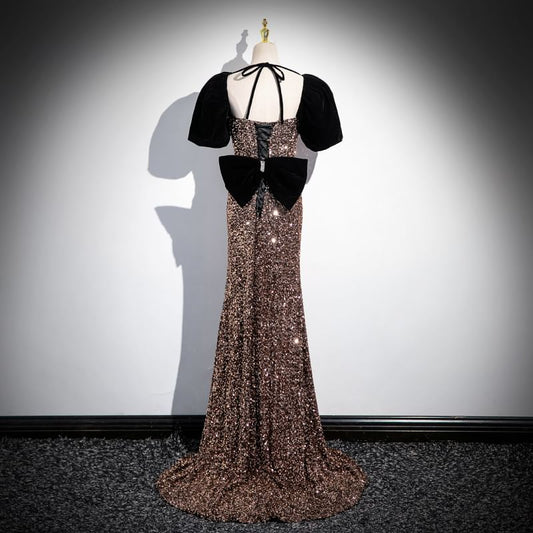 Short-Sleeve V-Neck Plain Sequin A-Line Evening Gown