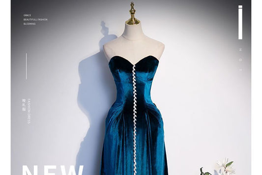 Strapless Plain Floral Accent Trained Velvet Mermaid Evening Gown
