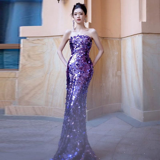 Strapless Sequin Trained Bow Back Mermaid Dress