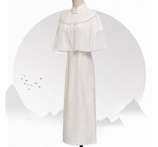 Set: Short-Sleeve Lace Midi Qipao + Faux Pearl Capelet