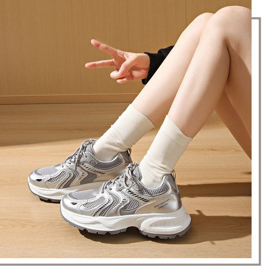 Platform Leather Lace-Up Mesh Sneakers Panel Genuine