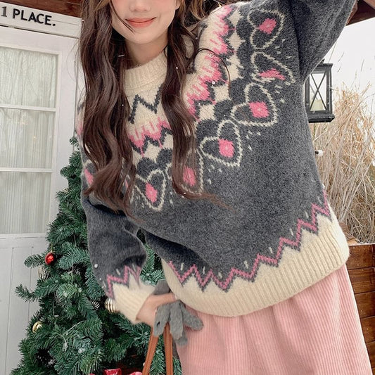 Set: Crew Neck Two Tone Jacquard Oversized Sweater + Beanie