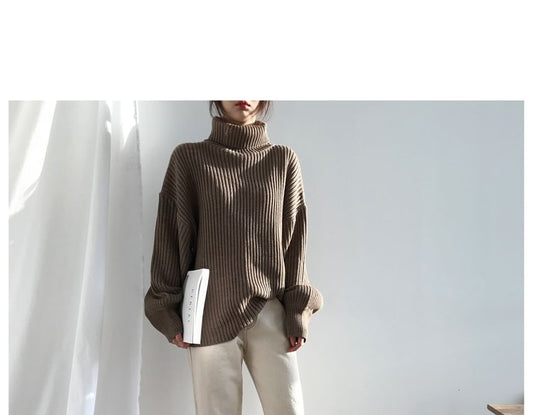 Bubble-Sleeve High-Neck Ribbed Sweater