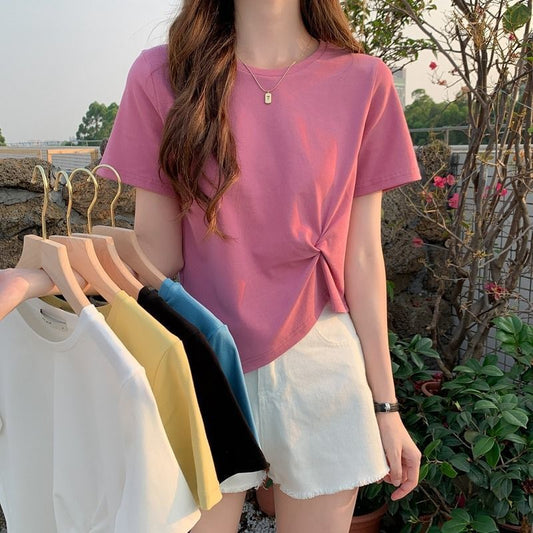 T-Shirt Crew Ruched Neck Crop Asymmetrical Plain Short-Sleeve