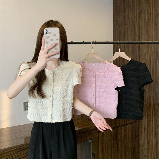 Top Embroidered V-Neck Button Short-Sleeve Panel