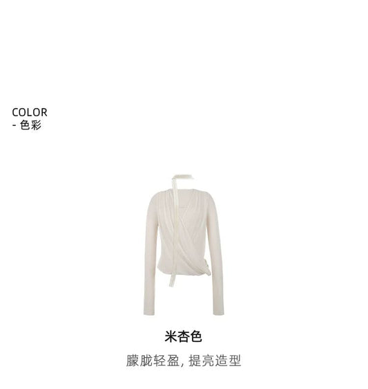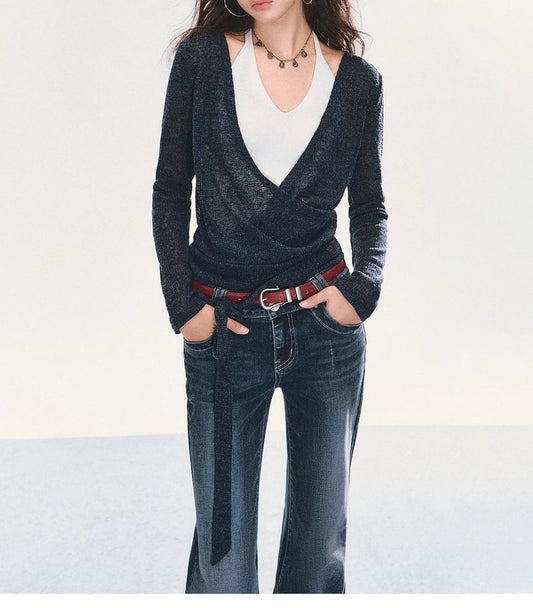 Long Sleeve V-Neck Plain Tie-Up Knit Wrap Top