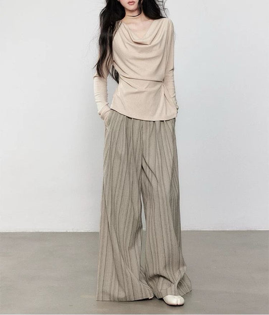 Long Sleeve Cowl Neck Plain Ruched Top / High Waist Striped Wide Leg Pants