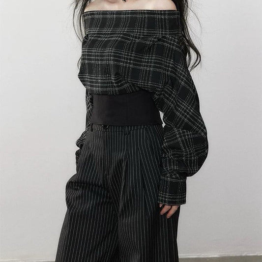 Long-Sleeve Off-Shoulder Plaid Crop Top / High Waist Striped Wide Leg Pants