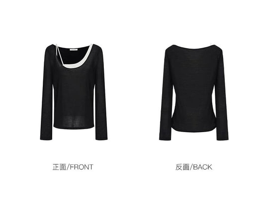 Set: Asymmetrical Neck Plain Tank Top + Long-Sleeve Scoop Neck Tee
