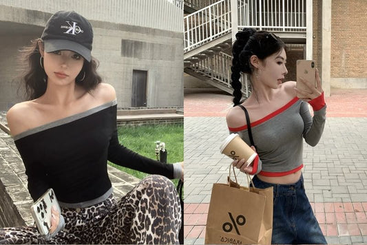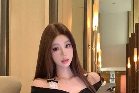 Long Sleeve Off Shoulder Plain Bow Ruffle Top / Spaghetti Strap Plain Panel Lace Mini Sheath Dress