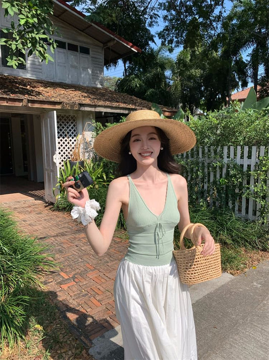 V-Neck Neck Tie Top Spaghetti Camisole Strap Plain