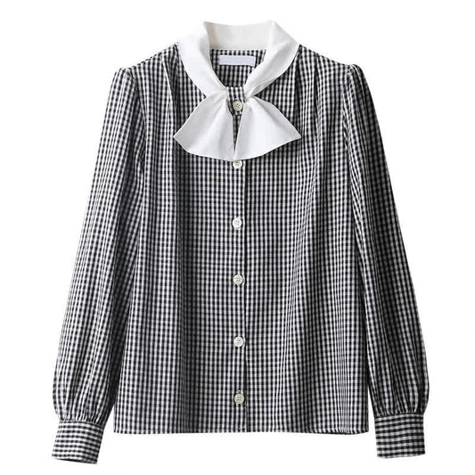 Lattice Print Bow Tie Puff Sleeve Shirt Workwear