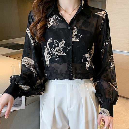 Black Floral Print Puff Sleeve Chiffon Shirt