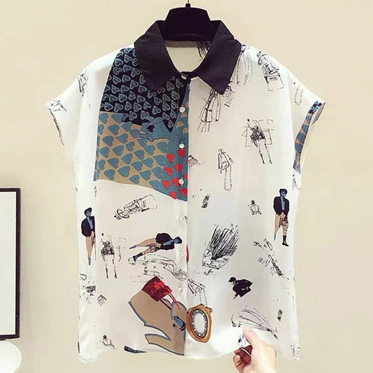 Oil Painting Print Blue Doll Collar Ruffled Shirt