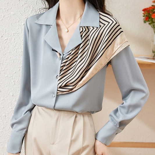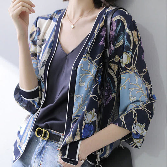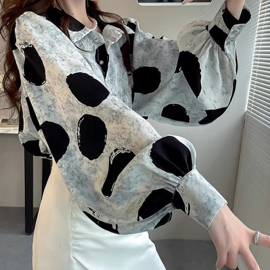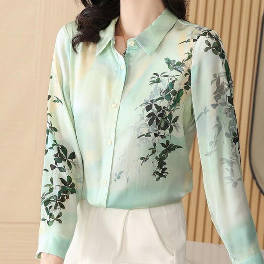 Irregular Lotus Print Short Sleeve Chiffon Lapel Shirt