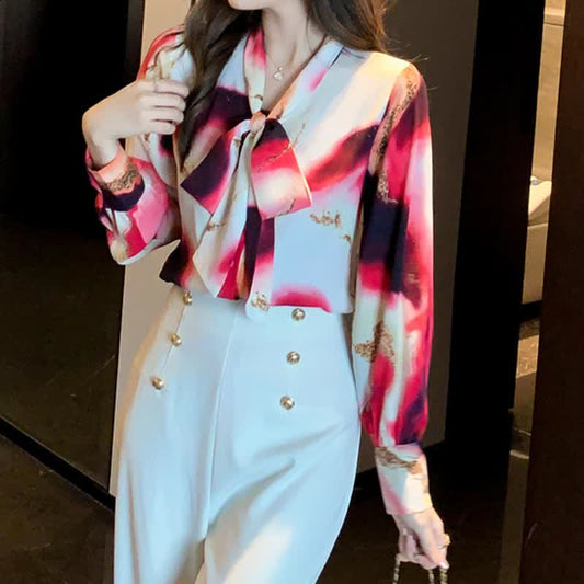 Colorblock Tie-dye Print Bowknot Lace Up Shirt