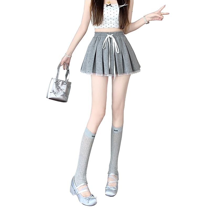 Drawstring Waist Pleated Lace Trim Mini A-Line Skirt