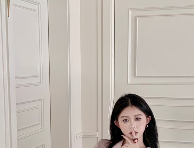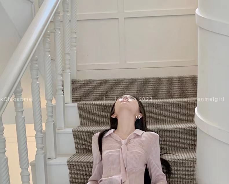 A-Line Waist / Mini Pleated Belt Skort Sleeve Collared High Striped V-Neck Plain Set Long Shirt