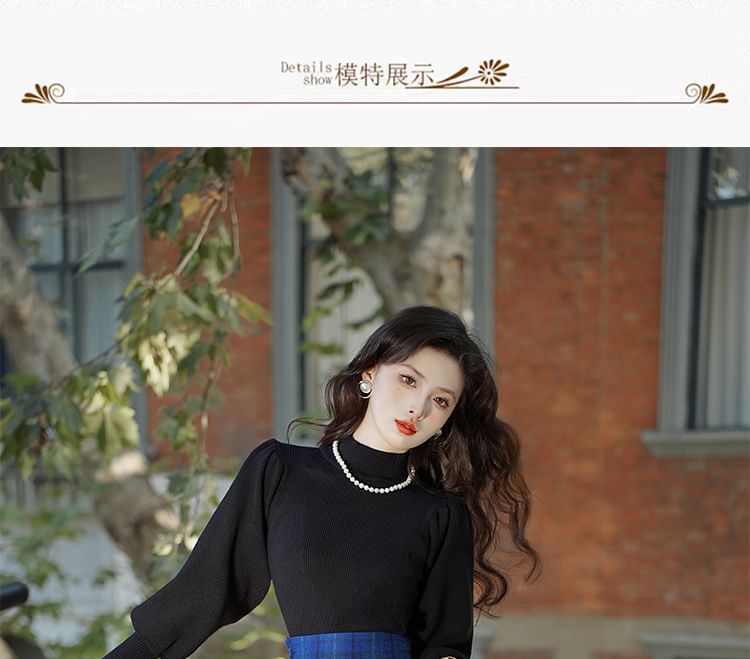 Balloon Sleeve Mock Neck Plain Sweater / High Waist Plaid Midi A