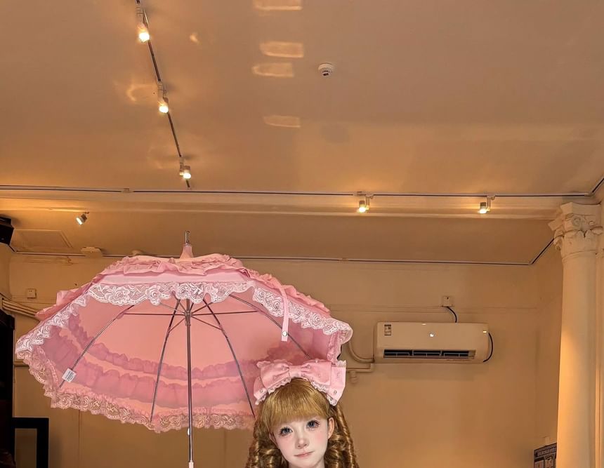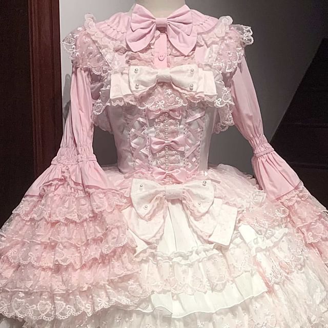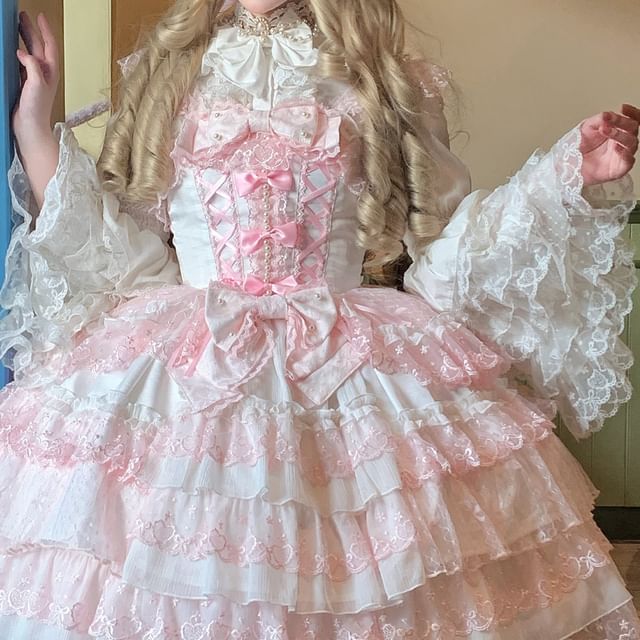 Bell Sleeve Collared Plain Bow Ruffle Panel Mesh Blouse