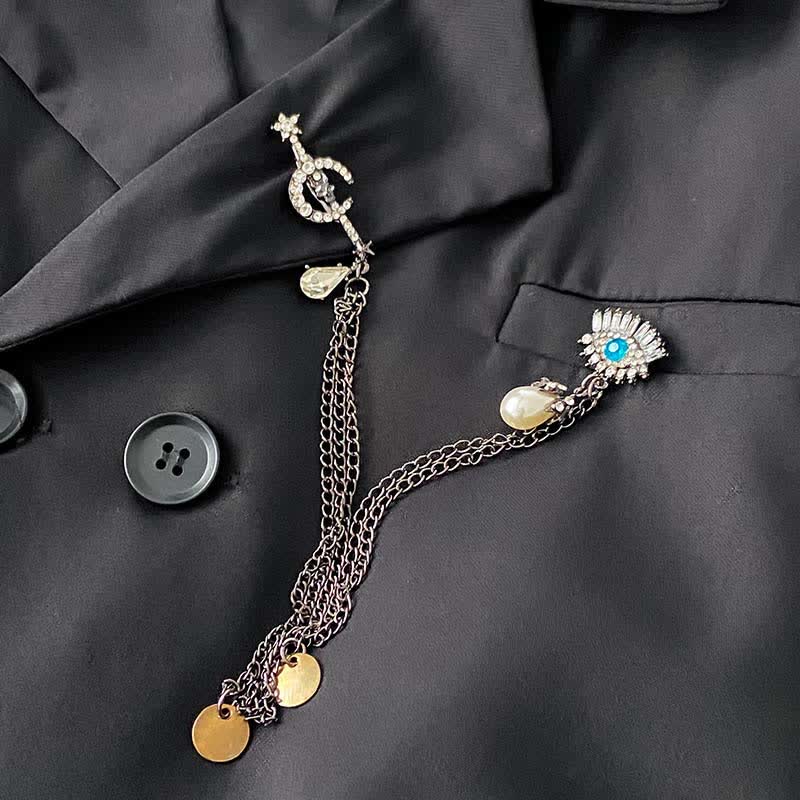 Turn heads with this elegant Black Gothic Chain Crop Blazer, featuring a unique design with hollow buckle details and a pleated skirt. Stay stylish and chic with this versatile piece that can easily transition from day to night. A must-have for any fashion-forward wardrobe.