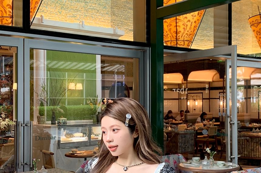 Short Sleeve Square Neck Plaid Bow Shirred Top