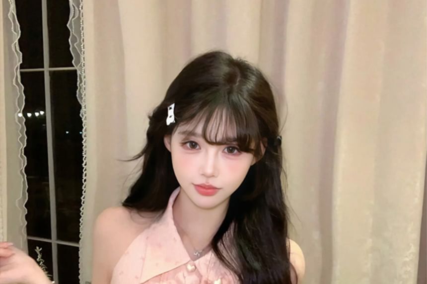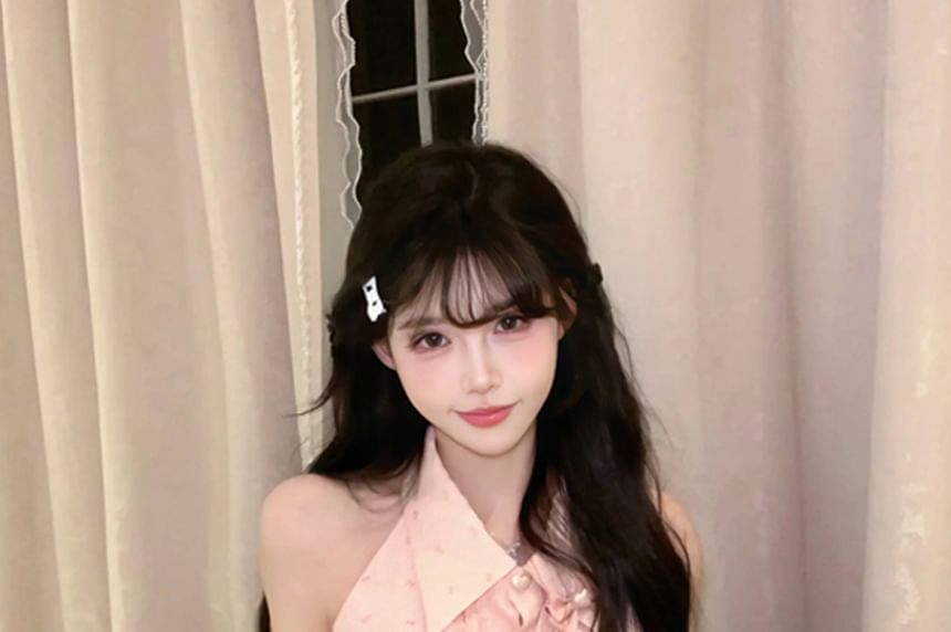 Sleeveless Collared Bow Print Ruffle Blouse / Bow Brooch / High Waist Mini Pencil Skirt / Set