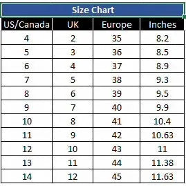 États-Unis 7,5-8,5 / UE 38-39 / Royaume-Uni 5-6 ;
