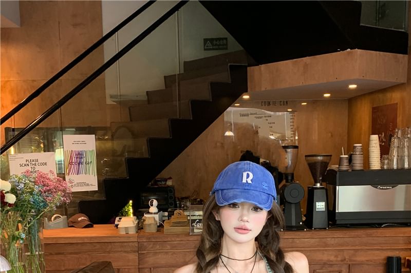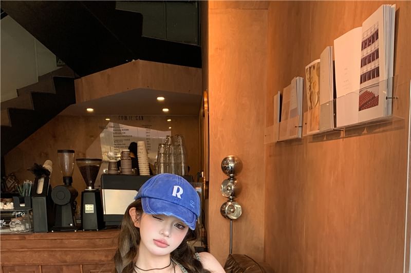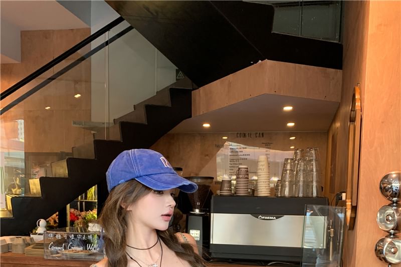 Button High Fit Mini Top Halter Waist Slim Crop Studded Denim Belted Skirt + Pencil Set: Camisole Frayed