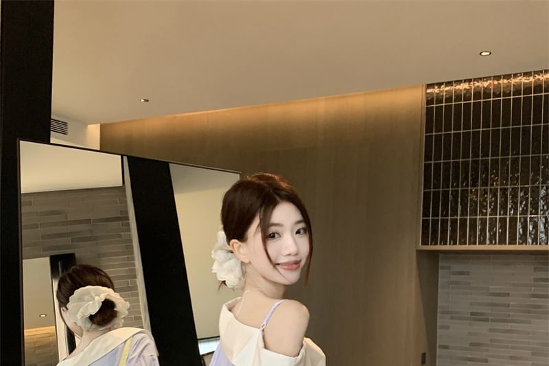 Long-Sleeve Cold Shoulder Striped Asymmetrical Button-Up Blouse