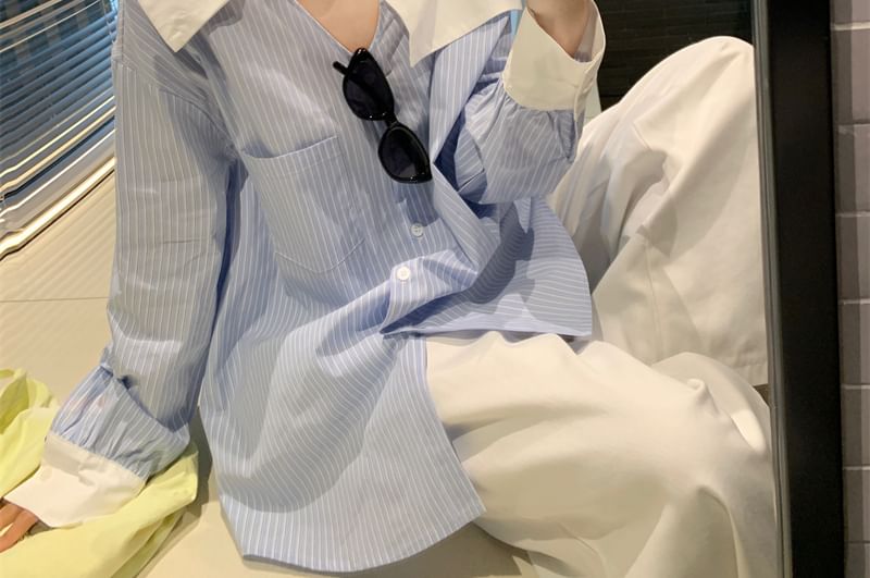 Button-Up Asymmetrical Striped Cold Long-Sleeve Shoulder Blouse