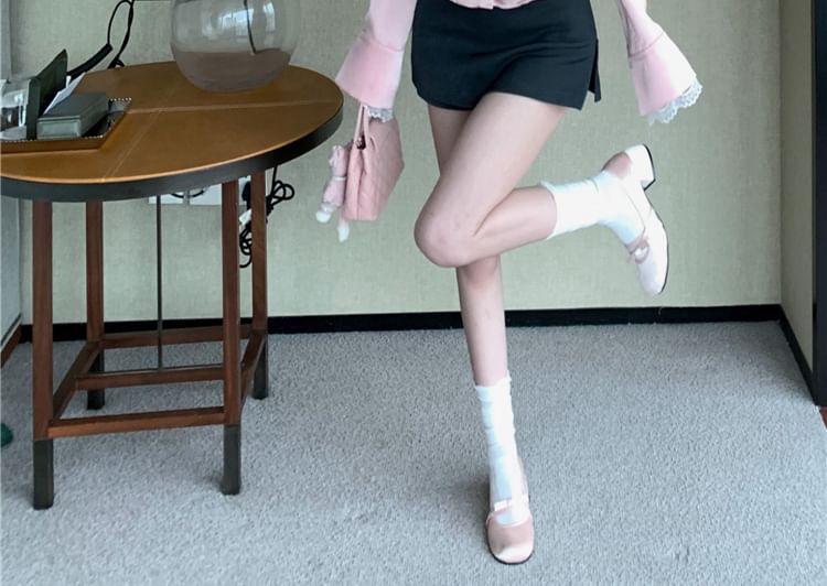 Long-Sleeve Collared Lace Trim Button-Up Blouse / High Rise Plain Mini Pencil Skirt