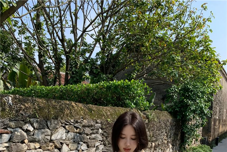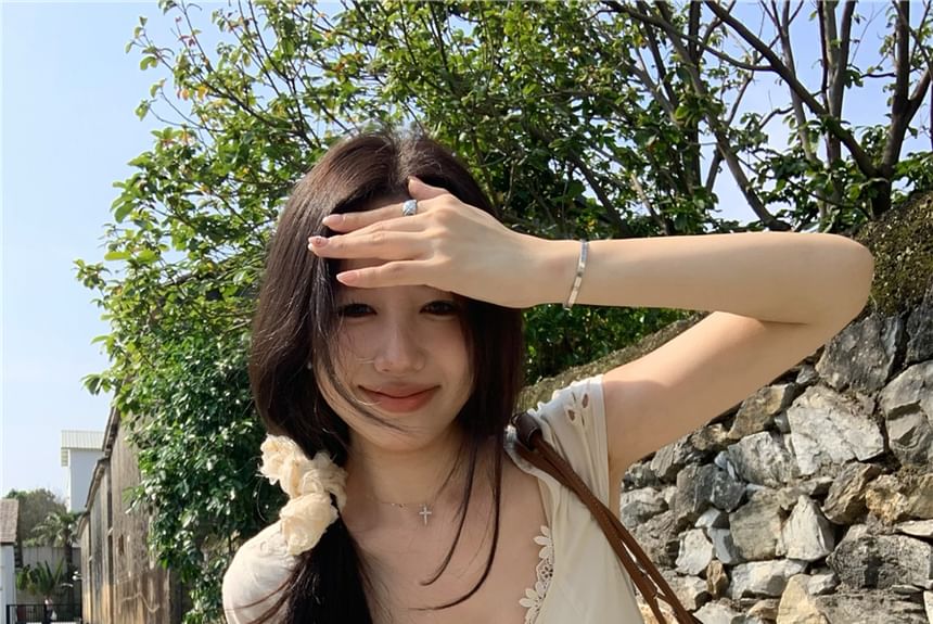 Cap-Sleeve V-Neck Plain Lace Panel Buttoned Eyelet Mini A-Line Dress / Maxi Mermaid Dress