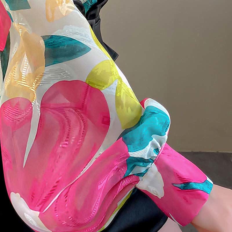 Color Floral Print Puff Sleeve Lapel Shirt Workwear