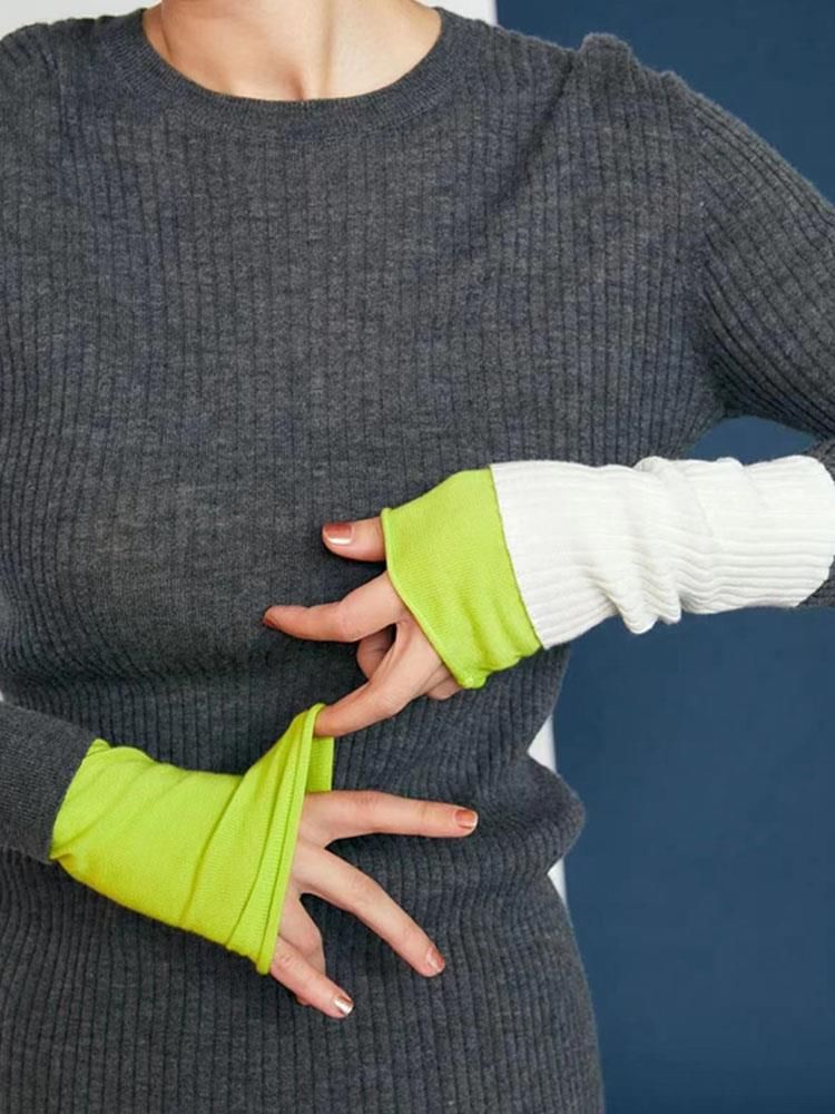 Long-Sleeve Crew Neck Two Tone Knit Top