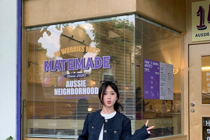 Crew Neck Plain Button-Up Tweed Crop Jacket / Mid Rise Washed Wide Leg Jeans