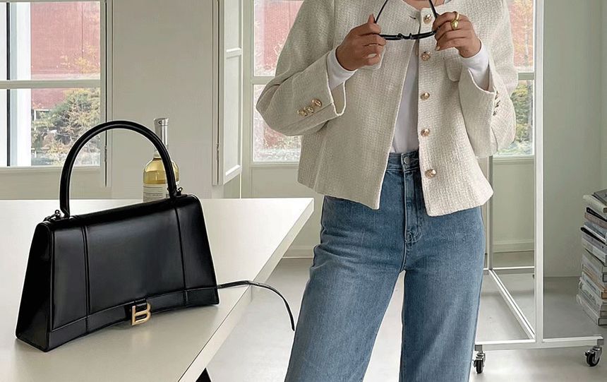 Crew Neck Plain Tweed Button-Up Jacket