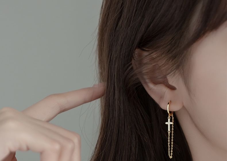 Cross Rhinestone Chain Sterling Silver Dangle Earring