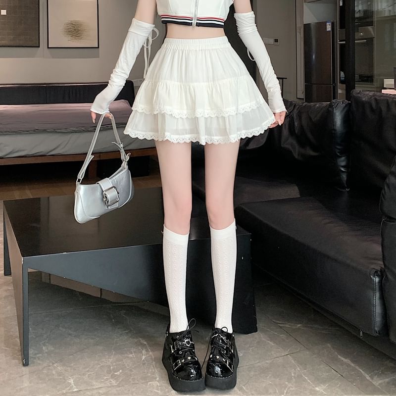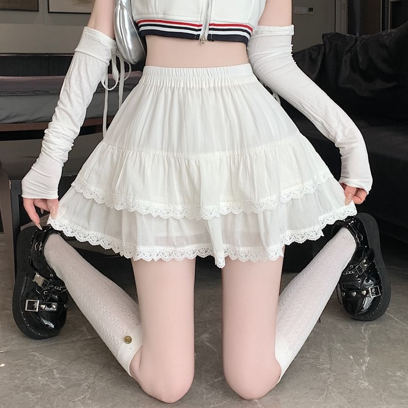 Balletcore Elastic Waist Plain Tiered Lace Trim Mini A-Line Skirt