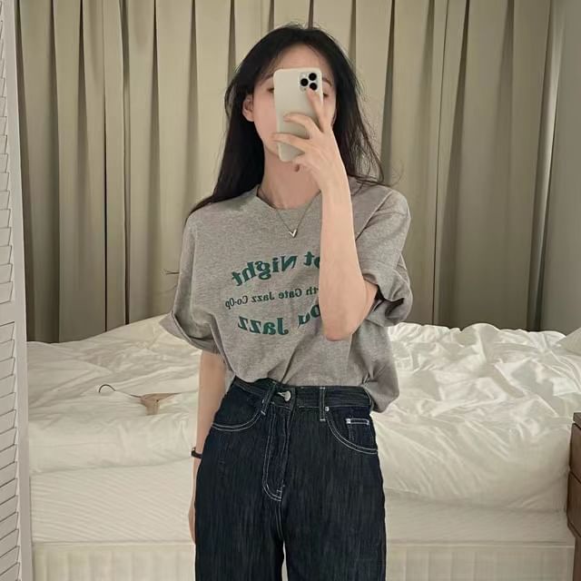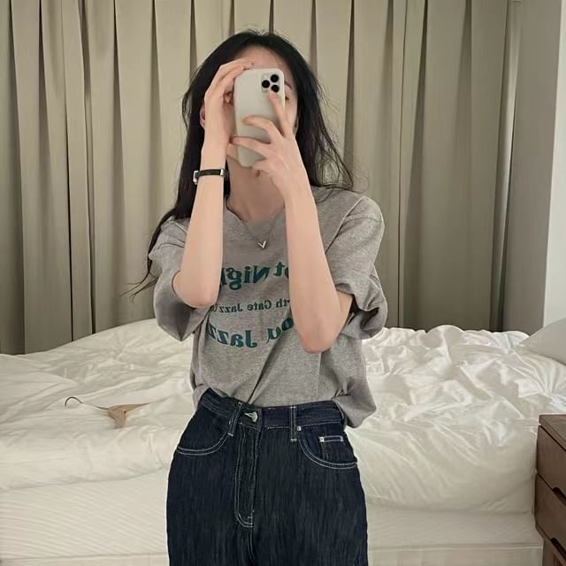 Elbow-Sleeve Crewneck Lettering T-Shirt