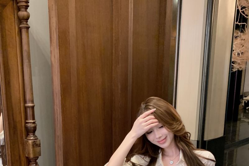 Long-Sleeve Flower Embroidered Shirt / High Rise Ruched Bow Mini Pencil Skirt